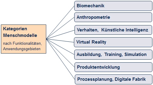 Insgesamt sind nahezu 100 Entwicklungen zu digitalen Menschmodellen in der Literatur genannt. Nach Funktionalitäten bzw. Anwendungsgebieten lassen sich Menschmodelle in die nachfolgenden Kategorien einordnen.