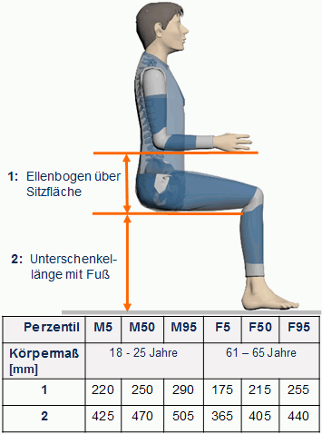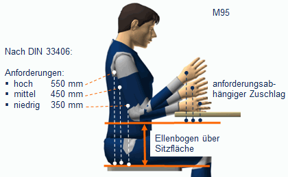 - Arbeitsflächenhöhe im Sitzen (M95) = Unterschenkelfreiraumhöhe + Arbeitshöhe - Arbeitsstellenhöhe