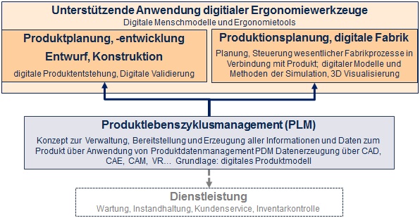 Digitale Ergonomiewerkzeuge ordnen sich innerhalb des Produktlebenszyklusmanagement PLM in die Anwendungsbereiche Produktplanung, -Entwicklung (Entwurf, Konstruktion) sowie Produktionsplanung, Digitale Fabrik ein. Die Digitale Fabrik umfasst digitale Modelle und Methoden der Simulation und 3D Visualisierung. Es dient der Planung und Steuerung wesentlicher Fabrikprozesse und -ressourcen in Verbindung mit dem Produkt, s. auch Digitale Fabrik.