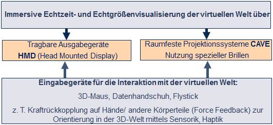 Darüber hinaus gibt es virtuelle Menschmodelle, die in Systemen der Virtuellen Realität eingesetzt werden. Virtuelle Realität (VR) bezeichnet "...die Darstellung und gleichzeitige Wahrnehmung der Wirklichkeit und ihrer physikalischen Eigenschaften in einer in Echtzeit computergenerierten interaktiven virtuellen Umgebung.." s. Virtuelle Realitaet Virtual-Reality-Systeme verwenden zur Visualisierung Head Mounted Displays oder eine CAVE (Cave Automatic Virtual Environment), bei der 3D-Bilder auf bis zu sechs feste, senkrecht zueinander stehende Projektionsebenen geworfen werden. Das virtuelle Menschmodell kann in der immersiven Umgebung mit räumlich virtuellen und realen Objekten in Kontakt treten. Ein Visualisierungssystem erzeugt eine stereoskopische Darstellung, die beim Anwender einen 3D-Tiefeneindruck hervorruft. Spezielle Brillen separieren die gleichzeitig auf den Projektionsflächen abgebildete Darstellung für linkes und rechtes Auge. Ein Subsystem (Tracking) ermittelt fortlaufend die Position des Kopfes in sechs Freiheitsgraden, mit denen die Steuerungssoftware in Echtzeit die korrekte 3D-Darstellung berechnet, s. auch Cave. Bei HMD erfolgt die visuelle Ausgabe auf zwei Displays direkt vor den Augen des Anwenders, s. Head-Mounted_Display. Durch die immersive Echtzeit- und Echtgrößen-Visualisierung von Produkten auf VR-Anlagen können vielfältige ergonomische Fragestellungen unter Einbeziehung virtueller Menschmodelle bereits vor dem Bau physischer Prototypen untersucht werden. So befasst man sich z. B. mit ergonomischen Faktoren im Designprozess der Produktentwicklung, mit physischen Eigenschaften und Verhaltensweisen des Menschen in der Produktion und bei Wartungsarbeiten sowie in Bezug auf Training und Ausbildung.