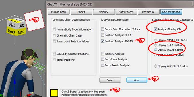 - im MonitorD > RK Dokumentation kann unter "View" die Bewertung angesehen werden, wenn zuvor der OWAS-Report aktiviert, alle anderen Report-Schalter deaktiviert werden
