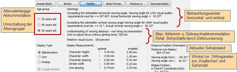 - Die Ergonomiekenngrößen werden im Monitor-Dialog in der RK Visibility ausgegeben.