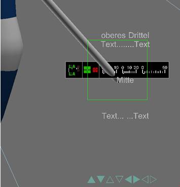 - Für die Altersstufen ohne Brillenkorrektur wird mit dem ocula_M_Target die Bildschirmmitte anvisiert, für Referenzpersonen mit Gleitsichtbrille das obere Drittel. Das zur Szene gehörende Objekt "Sehzeichen" enthält einen Text mit dem Wort "Mitte" bzw. "Oberes Drittel", was die Ansteuerung erleichtert. Sinnvoll ist es, die Übereinstimmung von ocula_M_Target und Sehziel über mehrere Ansichten zu kontrollieren.