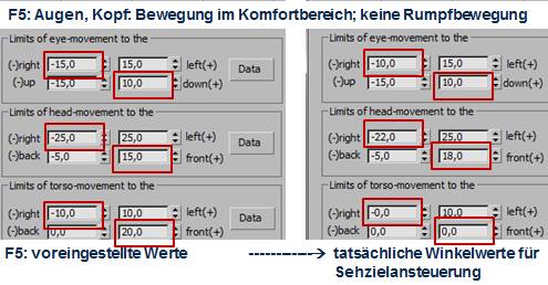 - Die voreingestellten Komfortwinkel für die Augen sollten nicht verändert werden, da die Erweiterung des Bewegungsbereiches eher über eine stärkere Kopfbewegung und danach über Körpereinsatz zu erwarten ist.