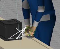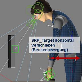 - Die über inverse Biomechanik erreichte Körperstellung ist auf Plausibilität zu überprüfen und ggf. sind Nachkorrekturen vorzunehmen. Unter Umständen ist es sinnvoll, das Becken des Menschmodells auszurichten, indem das Steuertaget SRP_Target horizontal verschoben wird. zusätzlich kann es erforderlich sein, die Rumpfbeugung anzupassen. Über den Steuerbone der Wirbelsäule (Bone 89) kann diese Rumpfflexion eingestellt werden.