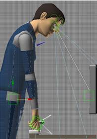 - Kopfbewegung ausführen: CharAT selektieren > ControlD > RK Bone Animation > Select Bone 90 --> im Feld Animation chanel y-Rotationswert erhöhen, bis der Sehstrahl das Sehziel erreicht