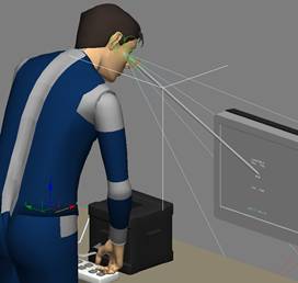Zunächst soll überprüft werden, ob Augenkontakt zur Bildschirmfläche bei Annahme einer komfortablen Körperhaltung der Referenzpersonen gesichert ist und welche Abweichungen von diesem Sollzustand auftreten. Zur optischen Unterstützung wird ein Sehstrahl an das Mittenauge (Mittelpunkt zwischen rechtem und linkem Auge) der Referenzpersonen angehängt und bei Bewegung von Augen, Kopf und Körper mitgeführt.